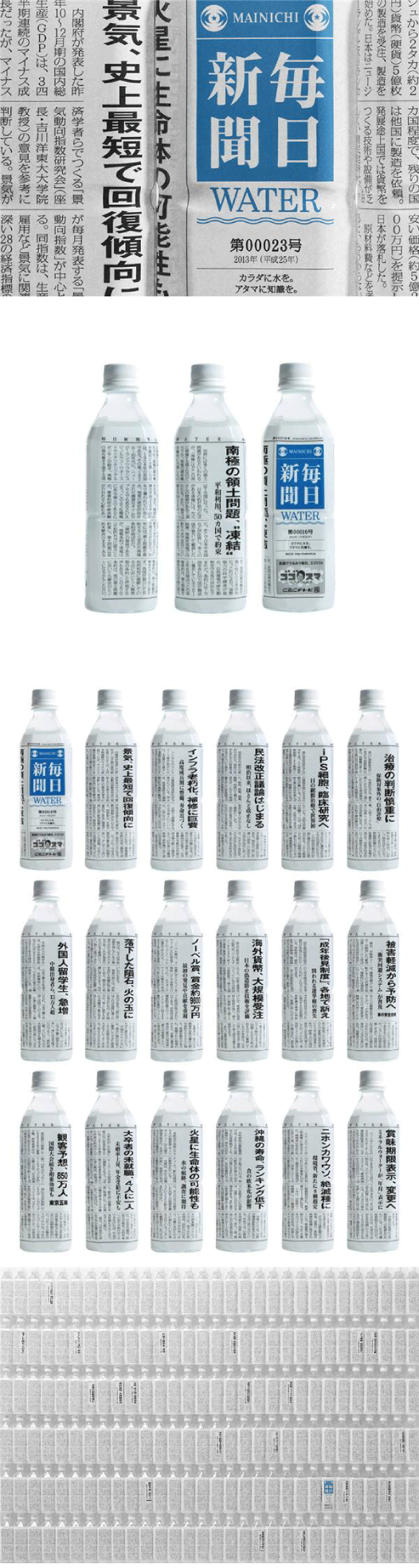 日本的每日新聞發現,買報紙的年輕人數量不斷降低,而買瓶裝礦泉水的年輕人卻有所增加。于是設計師 Yoshinaka Ono為每日新聞設計出承載新聞的礦泉水瓶,一個月內將 31 款新聞瓶子成功推入市場。一個意外收獲是,用報紙做產品包裝,逼格不僅沒有降低,而且在貨架上的識別度也很高。最終在一個月的時間里,幾乎每一個零售超市平均售出3000瓶這樣的News Bottle礦泉水。可以說,《每日新聞》既挽提高了銷量,又將用戶引向了移動端,包裝的作用意義非凡。