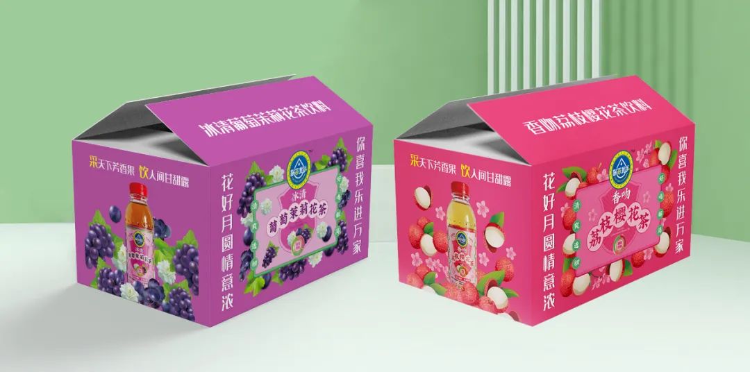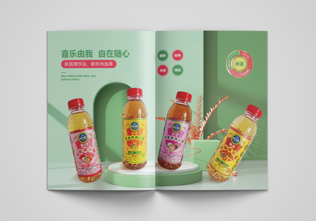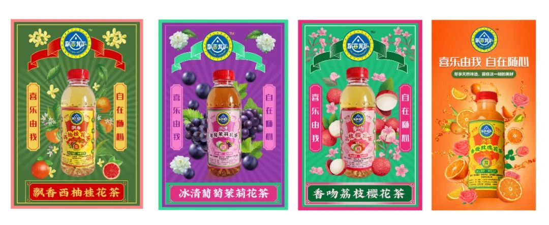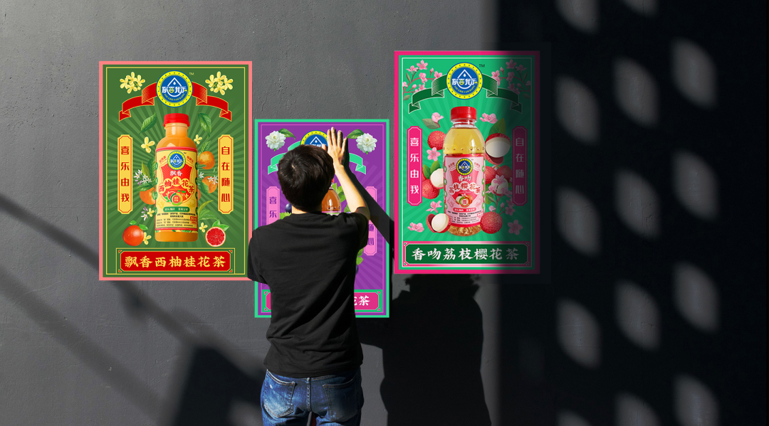 創(chuàng)造超級(jí)花邊,花邊的任務(wù)就是抓住消費(fèi)者的眼球,紅綠黃三種顏色的碰撞,耀眼醒目,強(qiáng)制消費(fèi)者看過(guò)來(lái),實(shí)現(xiàn)驚鴻一瞥的視覺(jué)效果,其次建立起品牌的獨(dú)特資產(chǎn)。四周以果味花茶飲料產(chǎn)品本身的原色為主色調(diào),富有強(qiáng)烈的視覺(jué)沖擊感,帶給消費(fèi)者充滿(mǎn)浪漫感的情緒互動(dòng)。西柚+桂花+茶,環(huán)繞四周,以高明的綠色和金色作為輔助色系,大膽的用色加深觀眾的情緒互動(dòng)。