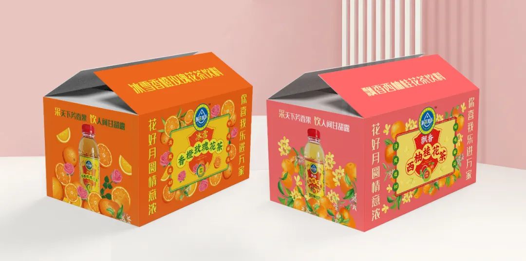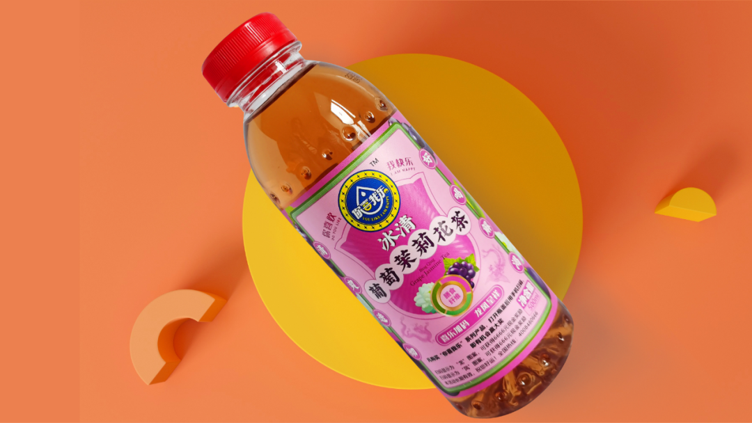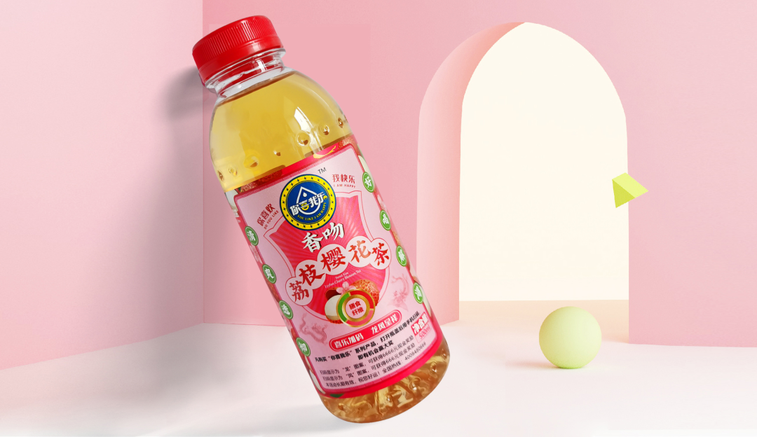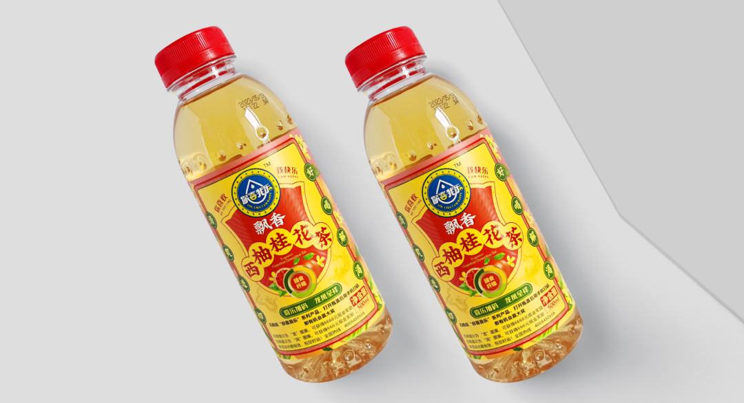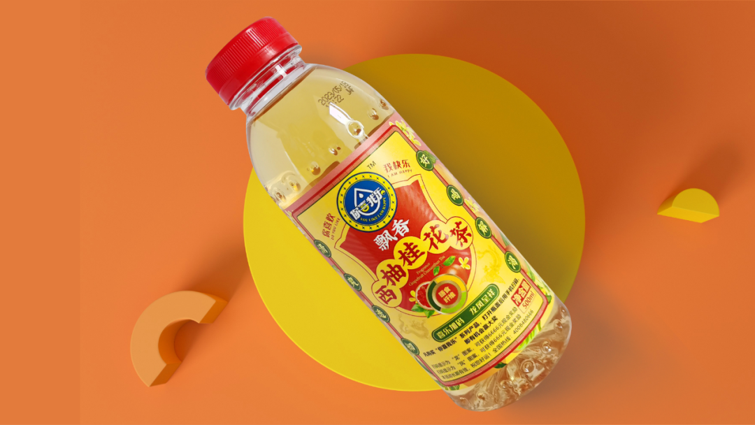通過(guò)層級(jí)的關(guān)系梳理,我們的動(dòng)作拆解為三步:步驟一,主標(biāo)初步圖形規(guī)整;步驟二,產(chǎn)品主題畫(huà)面設(shè)計(jì);步驟三,背景色彩規(guī)劃設(shè)計(jì)。我們的產(chǎn)品是飄香西柚桂花茶,以西柚和桂花為背景色符合常理和常識(shí),桂花黃相對(duì)中性,和西柚紅在一起冷暖、明度、純度對(duì)比鮮明,單看標(biāo)簽部分很和諧,也有整體感;如果整體瓶身是紅色,那整體的標(biāo)簽對(duì)比就不那么明顯。所以我們嘗試了色彩里的絕對(duì)中性色淺黃色和紅色邊框的對(duì)比后,效果立馬出來(lái)了,整體包裝對(duì)比鮮明、和諧統(tǒng)一。從遠(yuǎn)處看也是非常的顯眼。