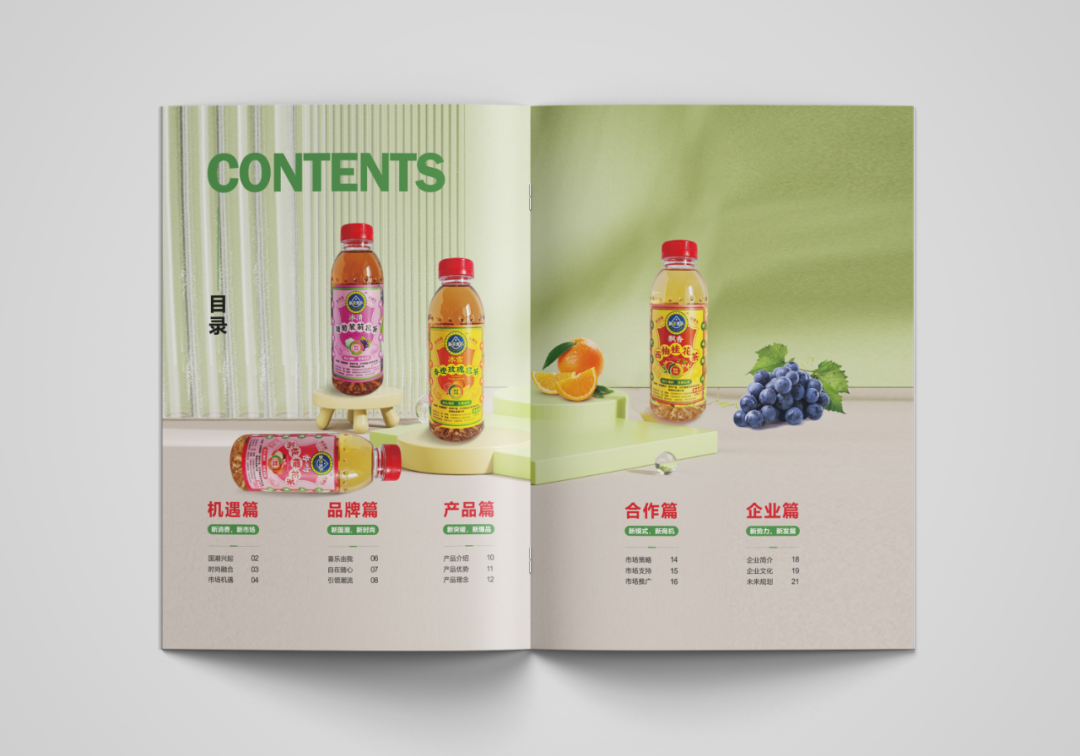 將產(chǎn)品包裝置于畫(huà)面中心上下?lián)螡M(mǎn)放到最大,周?chē)鷩@產(chǎn)品元素,以略仰視的角度創(chuàng)造港式茶飲的視覺(jué)沖擊力,豐富畫(huà)面的觀賞性,讓消費(fèi)者遠(yuǎn)遠(yuǎn)就能看到一瓶超大的飄香西柚桂花茶從畫(huà)面中呼之欲出。